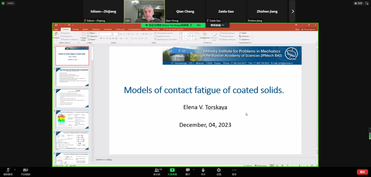 详情 2023年12月4日19:00,三级电影 “跨学科力学前沿研究“全球系列讲座第6期在线召开,并圆满结束。本期讲座邀请到Elena V. Torskaya教授作为主讲嘉宾,报告题目为“Models of contact fatigue of coated solids”。 Elena V. Torskaya教授毕业于莫斯科物理与技术学院,并于1995年获得该校固体力学科学研究生学位。她自1994年开始在莫斯科仪器工程与信息学院任教,并于1995年在俄罗斯科学院Ishlinsky力学研究所...