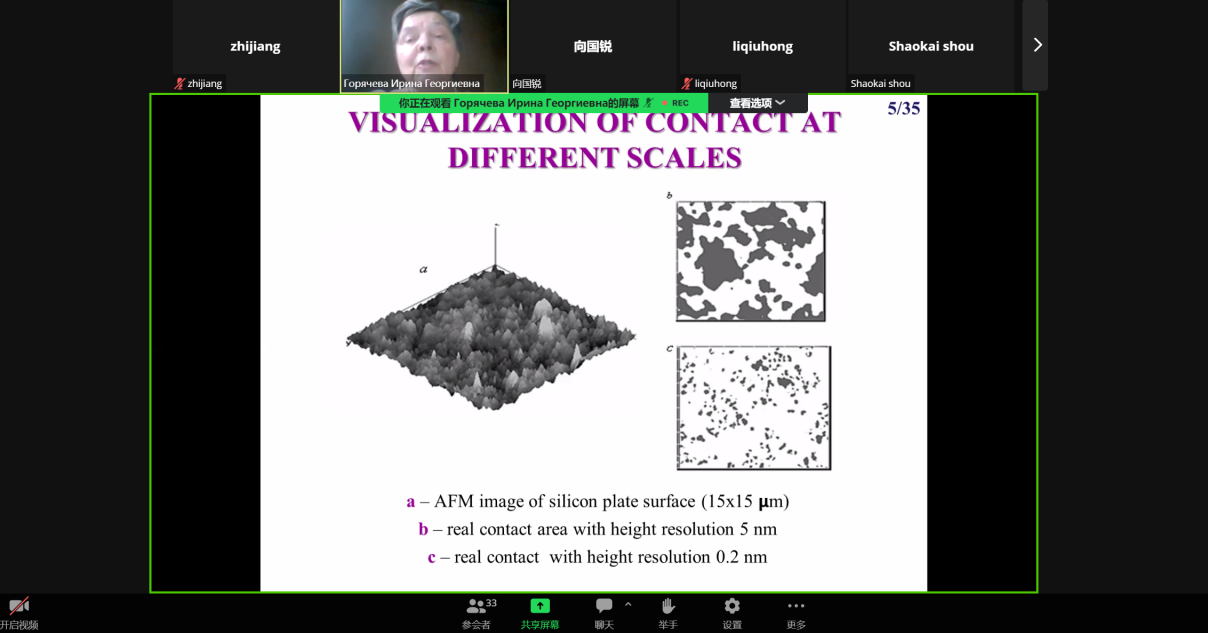 针对接触力学领域的最新进展,实际接触压力分布取决于表面微凸体的形状和密度,Irina Goryacheva教授着重介绍了一种新的分析方法来研究弹性体的法向接触。该方法基于离散接触问题的解析解,并考虑了接触点之间的相互影响。谈到了两种类型的接触问题:弹性半空间的三维周期性接触问题和弹性半空间的最终数量的压头穿透系统,这些问题的求解使得计算表面微几何参数对接触压力分布、实际和接触面积以及宏观尺度上的接触体接近的影响成为可能。