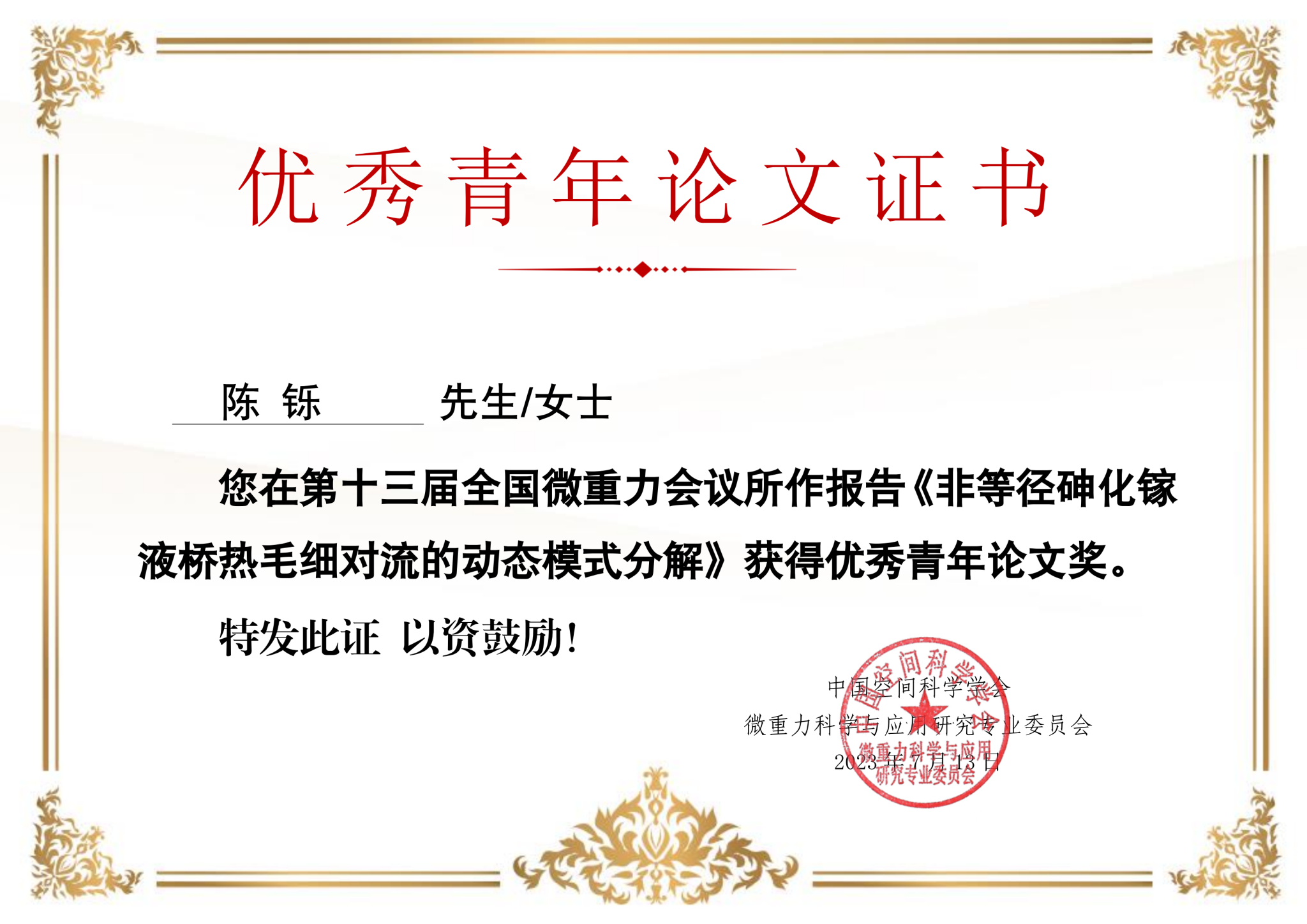曾忠教授课题组2021级硕士研究生陈铄做了题为 《非等径砷化镓液桥的热毛细对流的动态模式分解》的报告,并荣获 “优秀青年论文奖”。该报告介绍了课题组关于非等径液桥热毛细对流失稳的几何效应研究最新进展。基于针眼法等晶体生长技术,提出非等径液桥模型,在对其热毛细对流三维直接数值模拟基础上,采用动态模式分解(DMD)对不同形式的振荡热毛细对流进行分解,以提取振荡对流中时空特征的相干结构。研究发现,不同于等径砷化镓液桥热毛细对流第一次失稳为振荡失稳,非等径砷化镓液桥热毛细对流的第一次失稳为静态失稳,并随着温度梯度的增大进一步转变为振荡失稳。通过对温度振荡的动态模式分解,提供了存在包括不同波数混合模态振荡对流的证据,同时量化了振荡对流不同模态的贡献。相关成果近期已经被International Journal of Heat and Mass Transfer 杂志接受发表,曾忠教授与张良奇研究员为通讯作者,硕士研究生陈铄为第一作者。相关科研工作得到了国家自然科学基金、重庆市相关项目的资助。