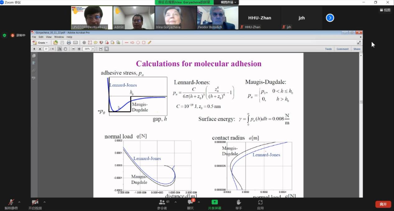 针对微观形貌及黏附效应的建模分析,Goryacheva教授从分析方法研究、黏附物理特性探索等多方面进行了详细的阐述,并与我院师生及海内外学者进行了深入探讨,细致地回答了相关学术问题。