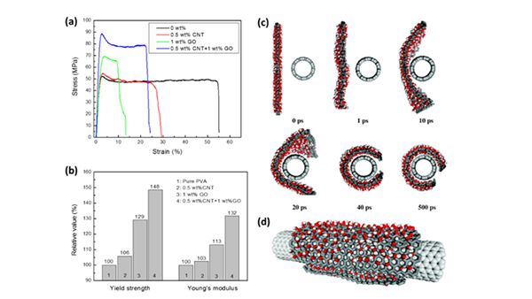 图2.(a)PVA,CNT/PVA, GO/PVA和GO-CNT/PVA薄膜的应力-应变曲线;(b)CNT/PVA, GO/PVA和GO-CNT/PVA复合薄膜的屈服强度和杨氏模量对比图;(c)GO与CNT相互接触时,从0到500 ps时的MD模拟过程快照,(d)500ps时的侧面构象图。