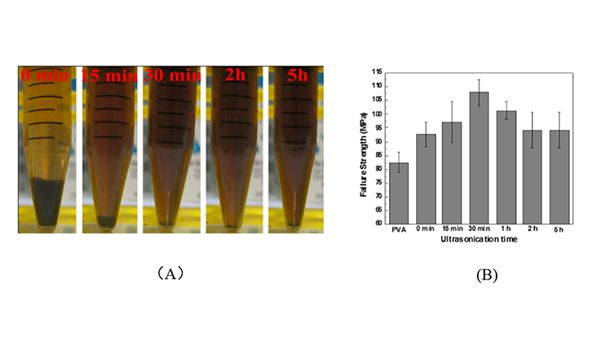 图4.(A)不同超声时间处理后GO水溶液放置7天的照片,(B)超声时间对GO/PVA复合薄膜断裂强度的影响。