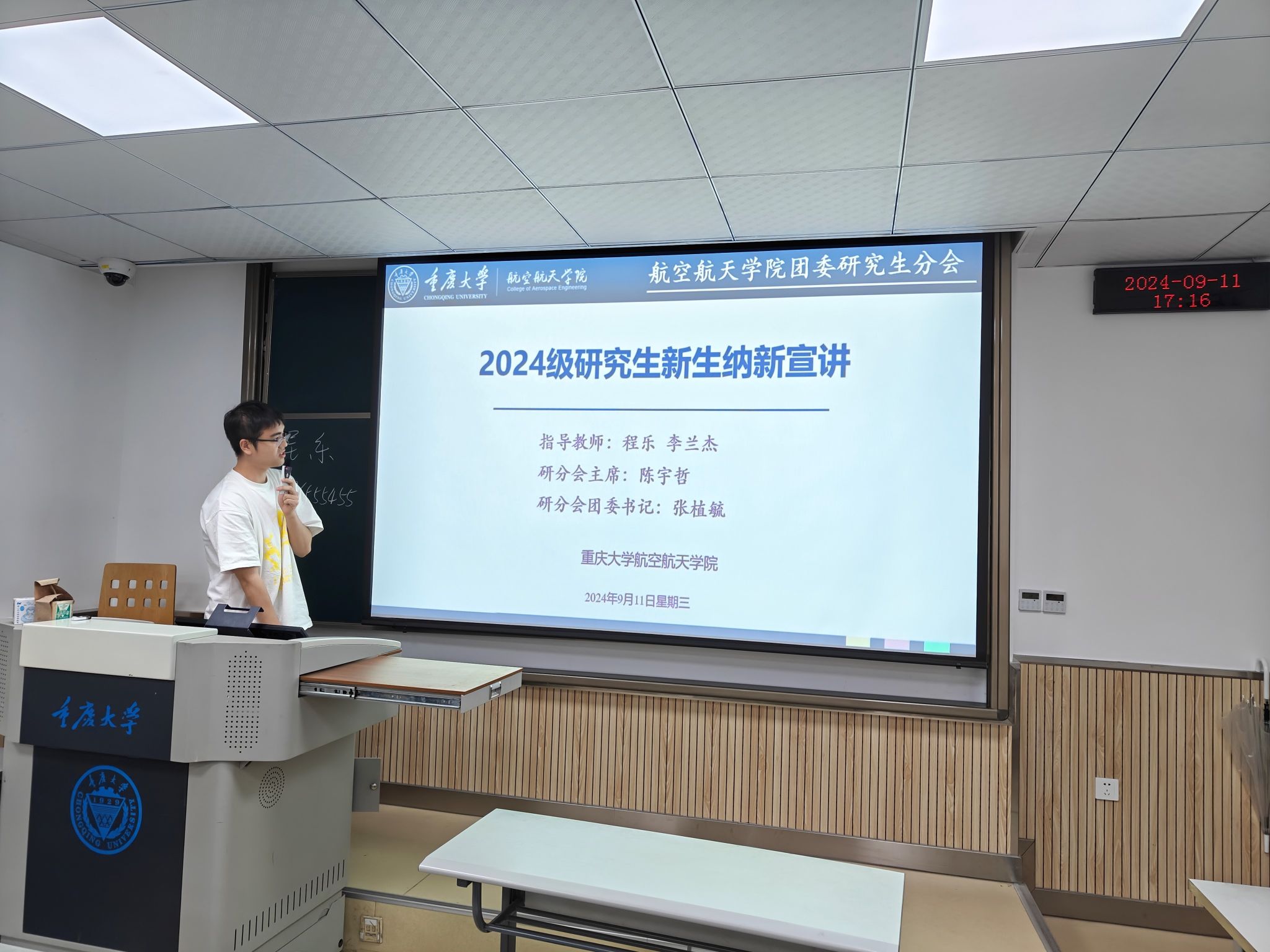 于9月11日下午3:00在研究生院509举办2024级研究生年级会暨新生入学教育大会,研究生辅导员李兰杰主持会议,学院党委副书记纪委书记程乐、团委书记陈勇凡、组织员伍丹、科研秘书李蔚、实验中心安全员尹瑞森、学院研分团委、研分会主要干部参加会议。
