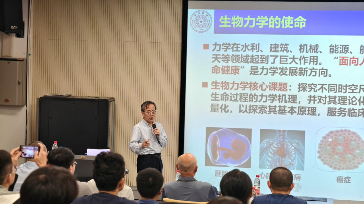 在报告中,冯西桥教授指出癌症及心脑血管、神经、免疫系统等重大疾病的发生发展,与生物学、化学、力学等因素的相互作用和协同演化密切相关。建立相应的生物力学理论与模型,对疾病的溯源、趋势研判及诊疗康复意义重大。随后,他围绕力-化-生耦合理论的基本思想,详细阐述了肿瘤的力-化-生耦合生长理论、免疫系统的力-化-生耦合理论等核心内容,并分享了团队将该理论应用于肿瘤、淋巴、神经系统等生理和病理过程研究的进展。通过深入浅出的讲解,结合详实的研究数据与案例,为在场师生打开了生物力学研究的全新视角。