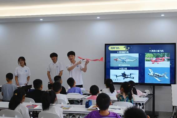 7月7日,实践团前往绵阳梓潼县青少年宫,开展航空航天知识科普和国防教育宣传等活动。以“国防脊梁,青春淬炼”“家国情怀我担当”为主题,发挥扎实的专业基础优势,开展国防科普宣传教育活动,通过细致讲解、模型演示以及互动体验,为孩子们探索航空航天播下了梦想的种子,展现了青年学子以专业所长服务社会、用青春热忱践行使命的责任担当。