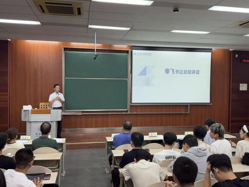 最后党委书记奉飞为大会作总结讲话。奉飞首先对新生们的加入表示热烈欢迎,同时强调,新时代的大学生要争做到学习好、身体好、心态好。希望同学们牢记初心,勇担时代重任,将个人成长与国家发展紧密相连,在大学四年里努力拼搏,实现自己的人生价值,奉飞表示,学院有信心为每一位学生的成长发展保驾护航,满足大家的合理期盼。