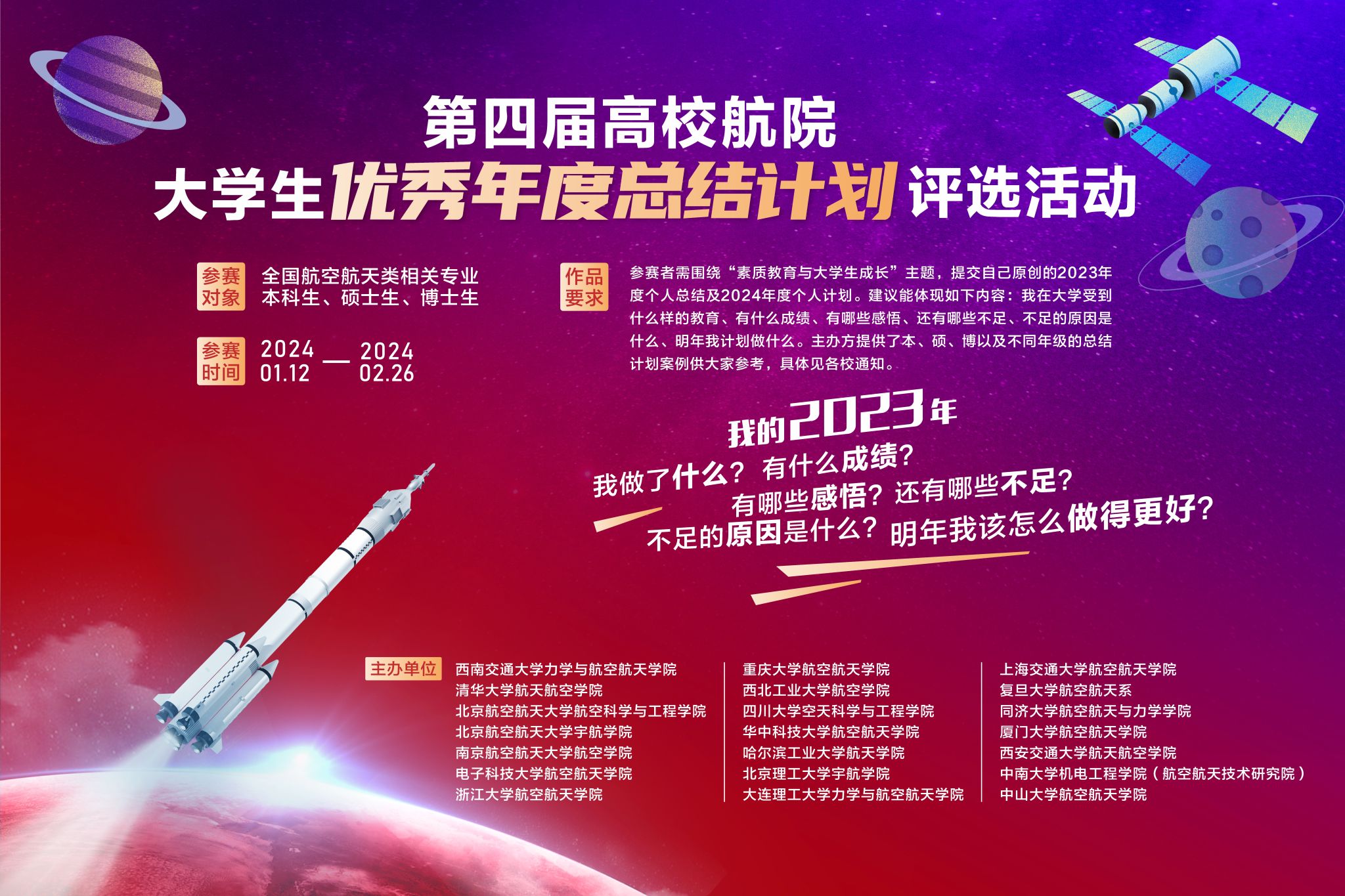 、西北工业大学、四川大学、华中科技大学、哈尔滨工业大学、北京理工大学、大连理工大学、上海交通大学、复旦大学、同济大学、厦门大学、西安交通大学、中南大学、中山大学等20所高校航空航天相关学院全体本科生、硕士生、博士生。