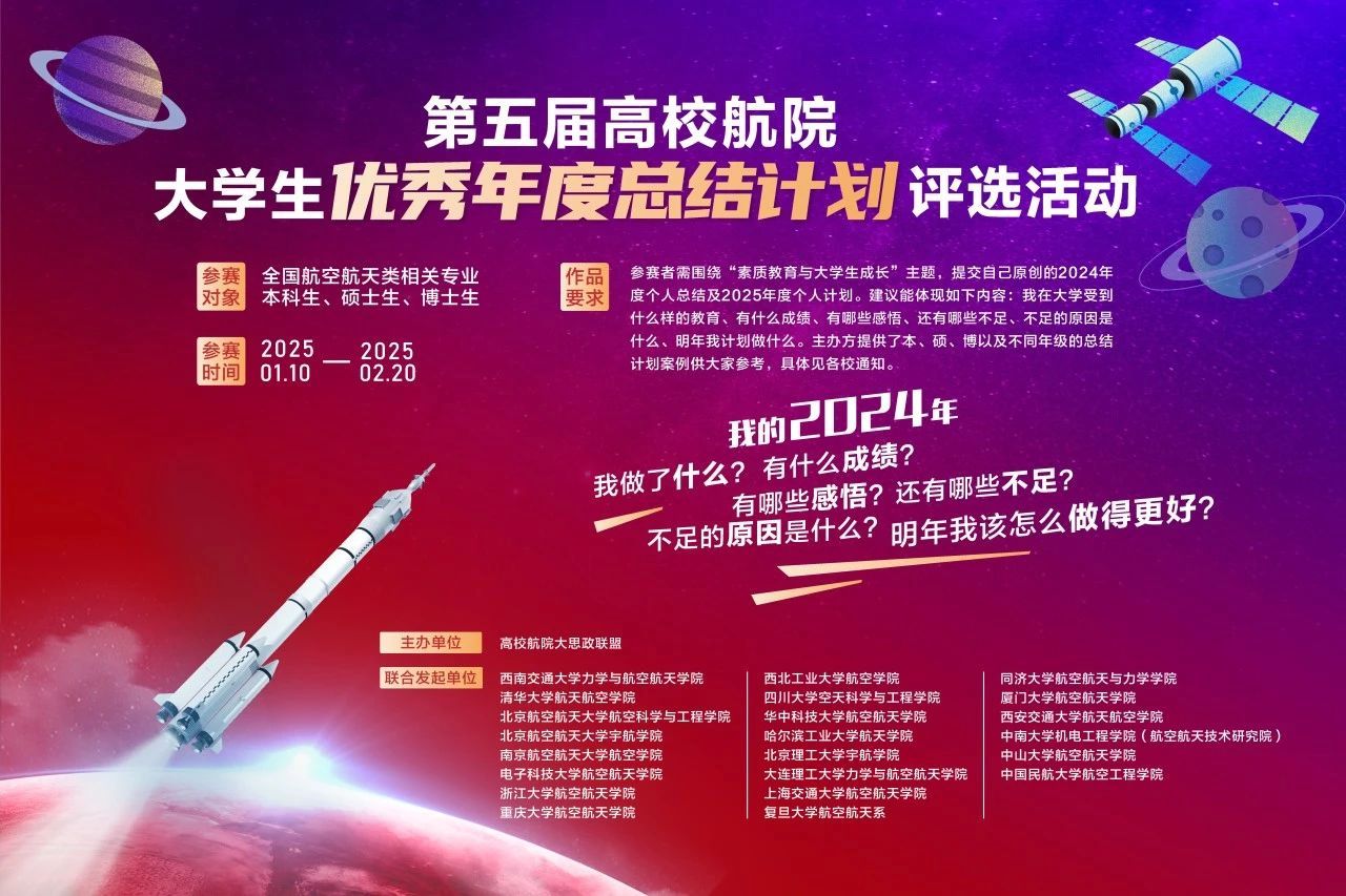 航空航天学院作为全国高校航空航天类院系大思政联盟的成员之一,联合22所高校特举办第五届高校航院大学生优秀年度总结计划评选活动。