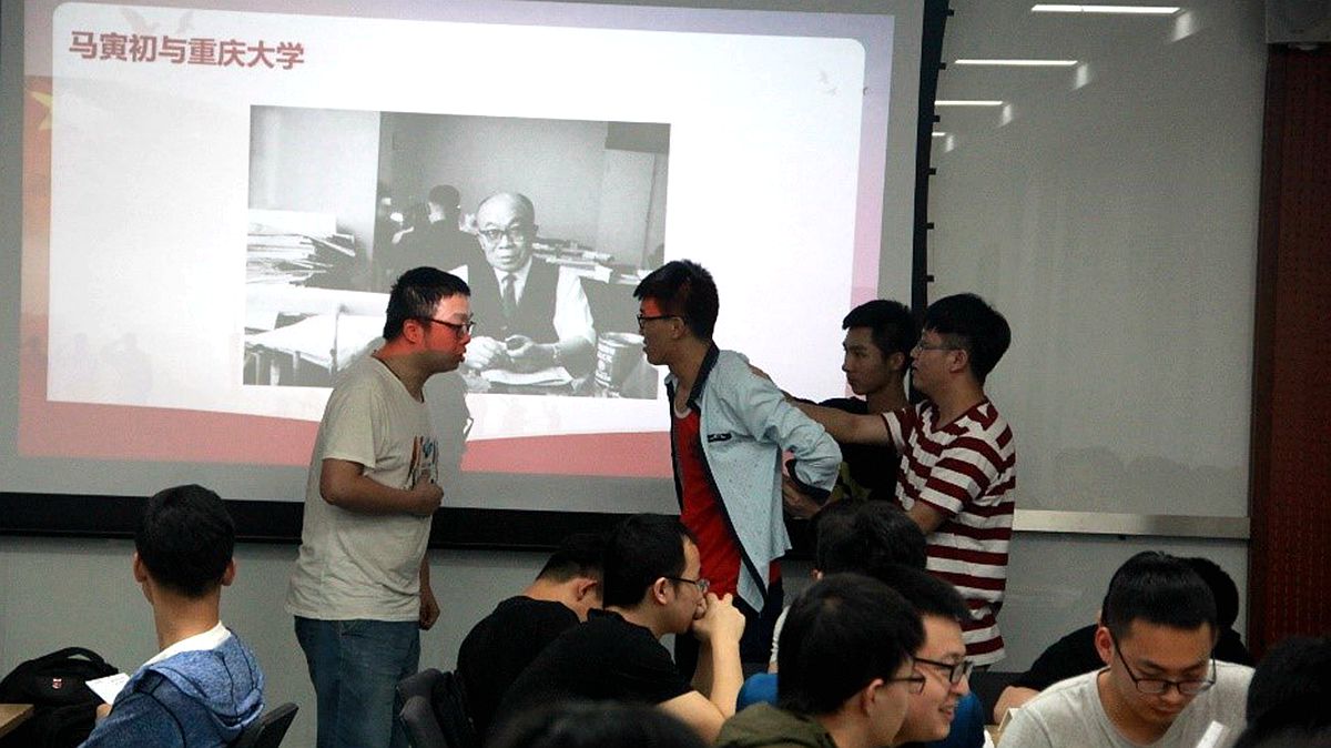 、民主湖以及重大师生的抗争—孙明霞,表演形式自行决定,并在分享结束后针对讲述内容进行提问,抢答正确小组获得相应积分。有的组用单人讲说或双簧的形式铿锵有力地为大家讲解了重大的历史,如民主湖、重大师生的抗争—孙明霞和七七抗战大礼堂。有的组用全组成员表演分工合作的形式,其中第一组同学边讲解边搭配音乐边表演抗战时期飞机轰炸工学院,巧妙地进行了抗战情景再现。第四组同学讲说风趣幽默,并且进行人物角色扮演,你一言我一语,把蒋介石和马寅初先生的性格刻画得栩栩如生。
