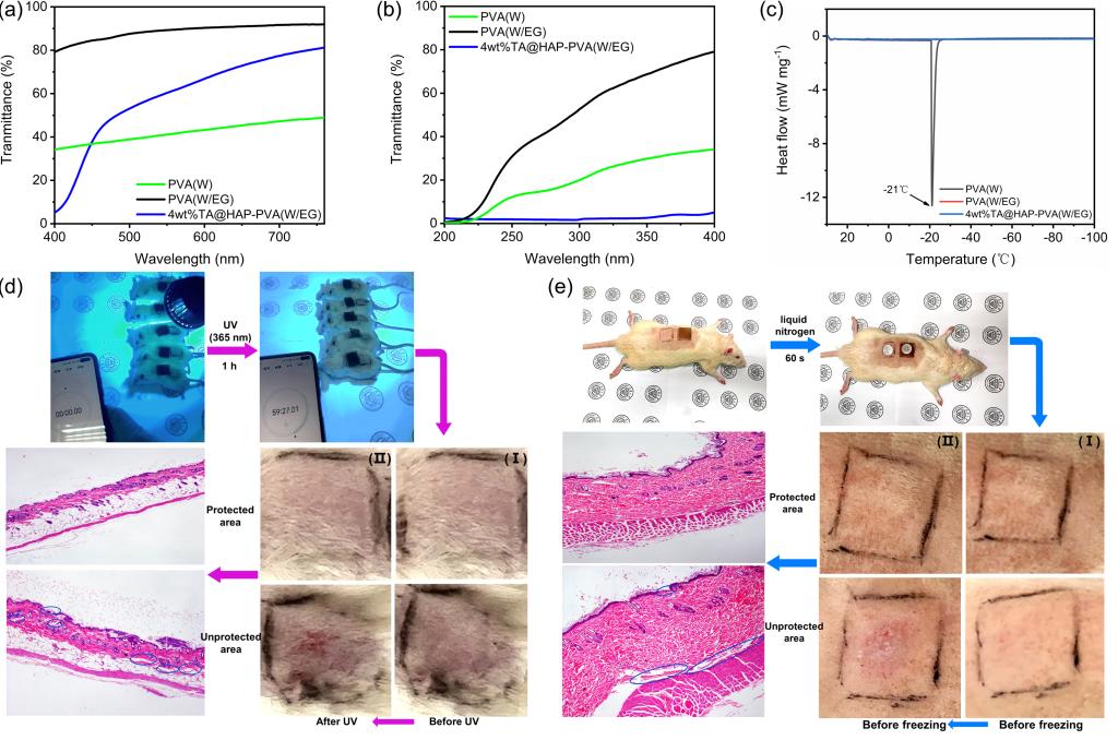 TA@HAP NWs-PVA(W/EG)离子水凝胶还在紫外线过滤,防冻和保水方面表现出良好的实用性,可用作在高原,高海拔或高空区域的抗紫外线敷料,以及严寒地区的皮肤敷料。其原理是利用尺寸效应的反射和儿茶酚基团的吸收紫外光的作用,实现了紫外线过滤功能。利用乙二醇和水分子之间的强氢键作用,实现防冻性和保水性。