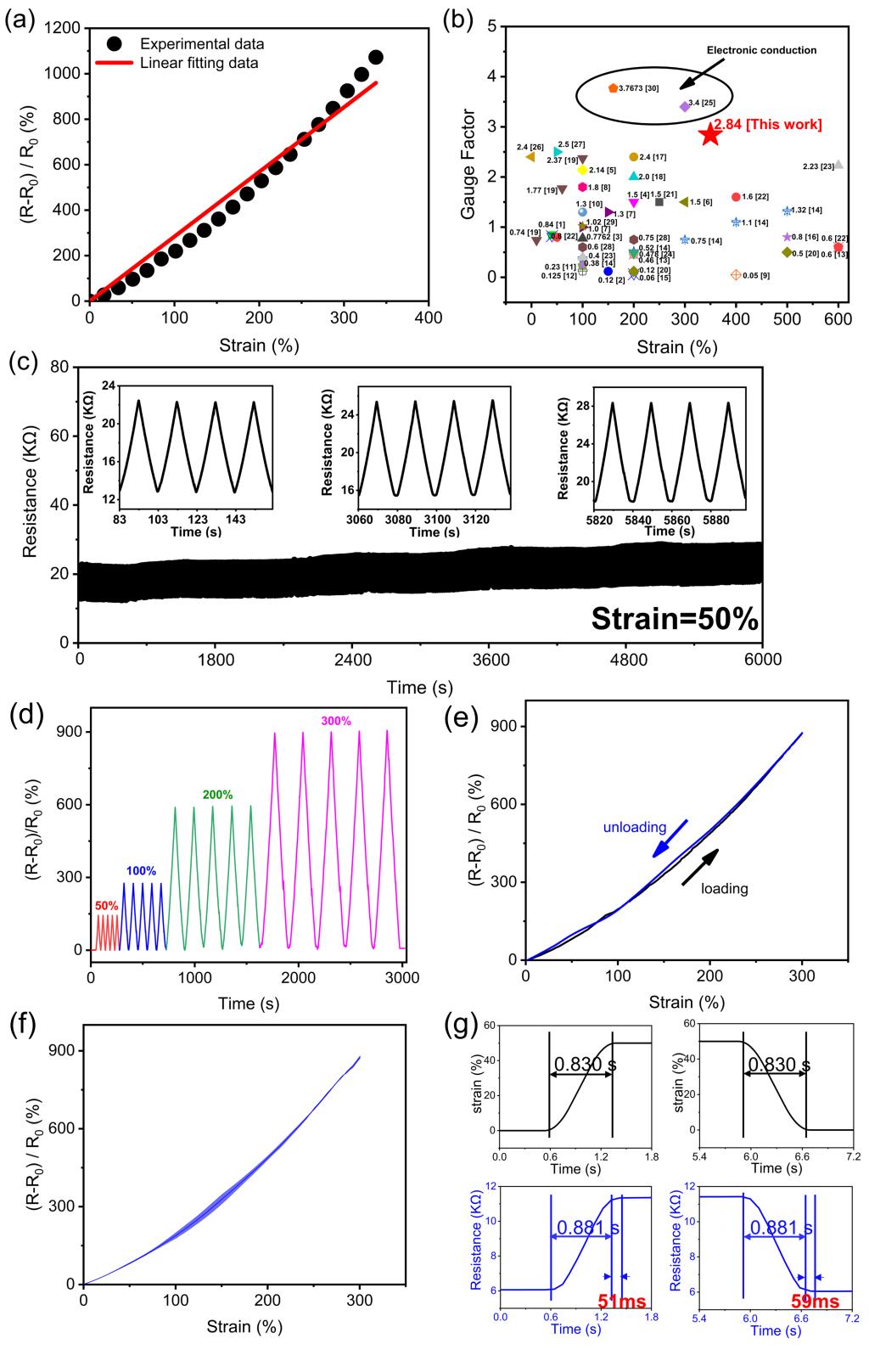 TA@HAP NWs-PVA(W/EG)离子水凝胶应变传感器具有宽的应变传感范围(350%),高线性度(R2=0.99003),高灵敏度(GF=2.84),低传感迟滞性(2.4%),快速响应(~50 ms)和耐用性。其大部分指标均处于本研究领域的先进水平。此外,还可以对于压力传感器和温度传感器,均表现出良好的线性度。利用温度和应变的灵敏度的巨大差异,实现了温度和应变之间的解耦目的。因此,该离子皮肤具有多用途传感的功能。