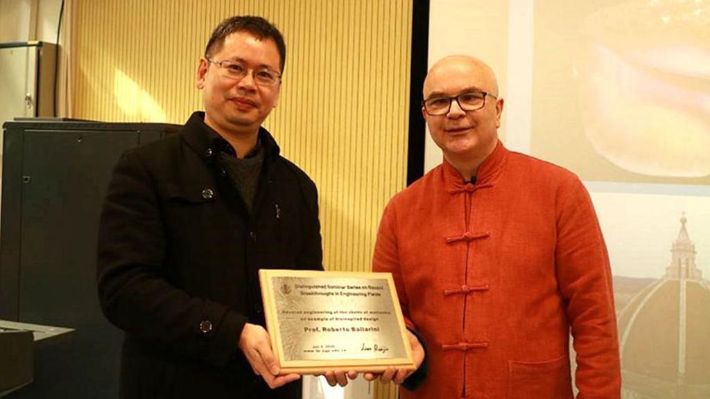 此次讲座内容丰富,教授的语言风趣幽默,并结合了很多绘声绘色的事例,使大家对软体动物贝壳的逆向工程以及仿生设计有了更多的了解。报告结束后,参与讲座师生和Roberto教授进行了热烈的学术交流与讨论,教授十分虚心的与大家进行交流。讲座的最后,金晓清教授向Roberto教授颁发了工程科学前沿讲坛纪念牌,学术活动宣告结束以后全场响起热烈的掌声。