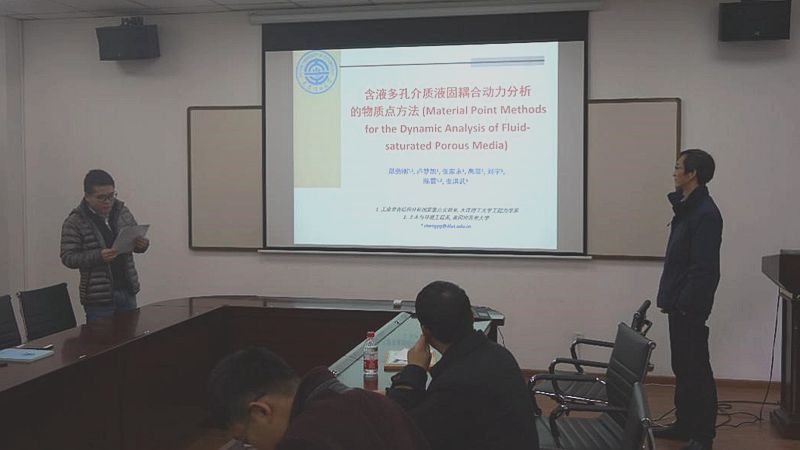 随后,郑勇刚教授介绍了近年来该课题组围绕含液多孔介质液固耦合动力行为分析的粒子类物质点方法开展了一系列研究工作。针对含液多孔介质液固耦合大变形及接触行为分析,提出了基于欧拉和拉格朗日网格相结合的接触算法,建立了统一的物质点求解方法。针对传统物质点方法在分析瞬态载荷作用下含液多孔介质时程响应时数值振荡较大这一问题,发展了时间间断物质点方法,提高了计算精度。针对孔隙尺度的含液多孔介质液固耦合行为分析,提出了基于粒子域的液固界面追踪算法,发展了物质点-格子玻尔兹曼耦合算法等。学术报告持续一个小时,在场师生踊跃向郑勇刚教授提问并展开了深入的讨论和交流,讨论氛围十分热烈。报告最后,三级电影