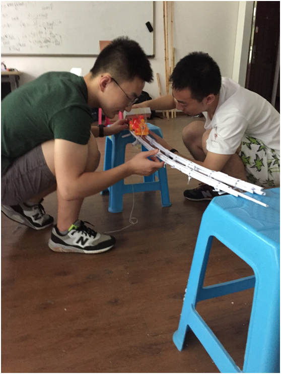 对五名同学进行了为期8天的专业技能集训。训练采用循序渐进的方式:先让学生熟悉比赛规则、练习对赛题理解,再让学生练习电钻、锉刀、木锯、游标卡尺等比赛常用工具的使用,然后练习纸张、木条、筷子等比赛常用材料的多种连接,并以往年真题为主导,进行实战训练。在训练中,学生熟练掌握了木条的各种榫卯结构的形式,纸张无胶水的连接形式、用大头针连接木筷的形式,木块和纸张间无胶水连接的形式,并了解了各种连接形式的强度。学生通过结构项目的动手训练,验证了各个承重结构的优势和劣势,动手实践了将物体的重量势能、弹簧和橡皮筋的势与小车的动能之间的转换以及常见能量转换形式。通过训练,学生也充分感受到团体赛的难度,大家意识到:在实践的过程中可能会遇到各种各样意想不到的问题,而想把自己的想法实现其实并不是一件简单的事情。训练加强了学生动手能力,使学生在思想的实现、方案的制定、动手能力、实物的成型等各个方面均有非常大的进步。